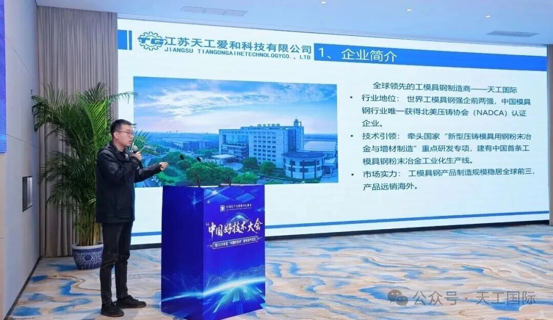 2025年11月26日,“中國好技術(shù)”大會暨2024年度“中國好技術(shù)”稱號授予儀式在北京舉行,天工國際有限公司下屬企業(yè)江蘇天工愛和科技有限公司(以下簡稱:天工愛和)憑借在高淬透性、高韌性壓鑄模具鋼領(lǐng)域的原創(chuàng)性技術(shù)成果和成熟的產(chǎn)業(yè)化能力,成功入選 “中國好技術(shù)” 榮譽榜單。天工愛和技術(shù)部副部長張鵬程在現(xiàn)場接受了“中國好技術(shù)”稱號授予,并代表公司對該項目技術(shù)進行了專題推介,系統(tǒng)展示了技術(shù)成果及應(yīng)用價值。這一國家級認可標志著天工在高端模具鋼國產(chǎn)化替代領(lǐng)域取得重大突破,也代表公司核心材料技術(shù)已躋身國內(nèi)領(lǐng)先、國際先進水平。